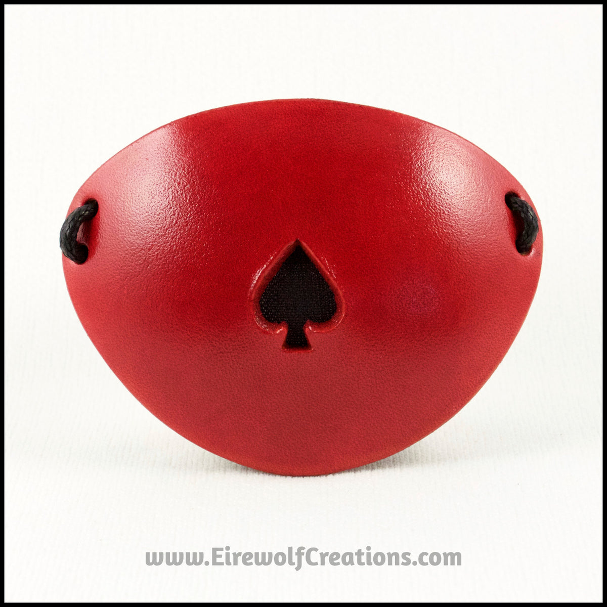 See-through Playing Card Eye Patches, red leather heart, diamond, club, or spade handmade masquerade, magician, larp, Halloween, or pirate cosplay costume